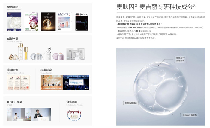 麦肤因是麦吉丽的灵魂抗老成分,我和团队经过全方位研究发现,它能够焕活细胞能量母体,提升肌肤细胞能量的 ATP ,可以改善肌肤松弛、皱纹等一些岁月带来的痕迹。麦肤因的研究成果,我们已经发表了十几篇国际SCI的论文,还申请了20多项专利。现在麦肤因已经广泛应用到麦吉丽的大部分产品中,凭借卓越的功效赢得了消费者的认可,成为我们的技术壁垒。