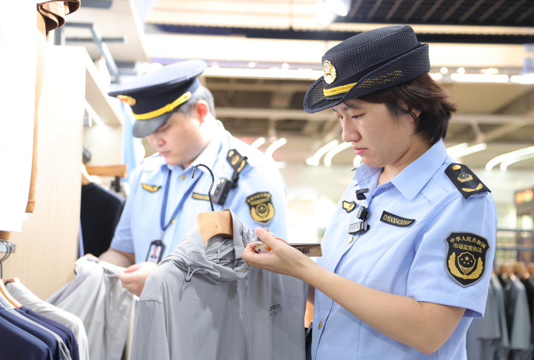 执法人员检查防晒服上的标示。董芳忠/摄