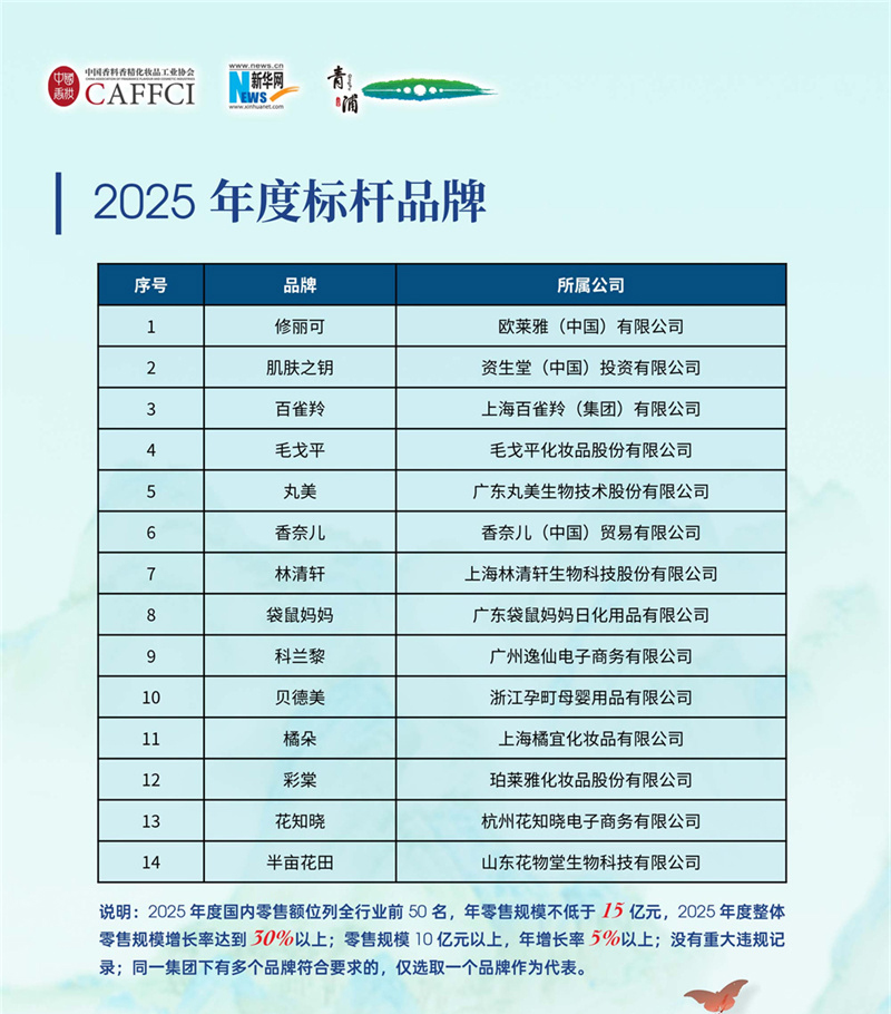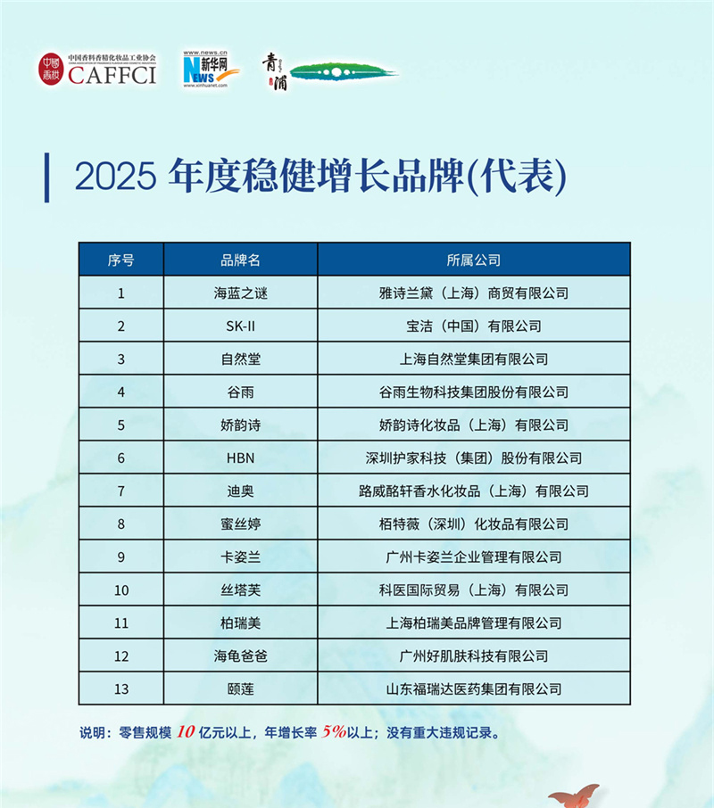 发布会同时公布了2025年度标杆品牌与稳健增长品牌代表,其中标杆品牌需满足2025年度国内零售额位列全行业前50名、年零售规模不低于15亿元、增长率30%以上、无重大违法违规记录等要求,包括百雀羚、毛戈平、丸美等国货品牌及修丽可、肌肤之钥等国际品牌入选;稳健增长品牌代表需满足零售规模10亿元以上、年增长率5%以上、无重大违规记录等要求,包括自然堂、谷雨、HBN等国货品牌及海蓝之谜、SK-II 等国际品牌入选,再次呈现理性消费的发展趋势。