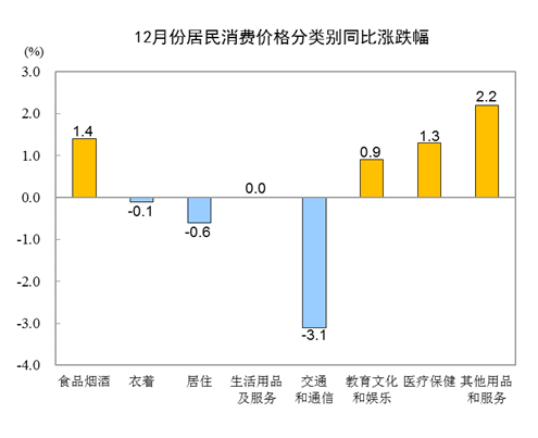 12月份,食品烟酒类价格同比上涨1.4%,影响CPI(居民消费价格指数)上涨约0.44个百分点。食品中,鲜菜价格上涨6.5%,影响CPI上涨约0.17个百分点;鲜果价格上涨6.5%,影响CPI上涨约0.11个百分点;水产品价格上涨1.7%,影响CPI上涨约0.03个百分点;畜肉类价格上涨0.6%,影响CPI上涨约0.04个百分点,其中猪肉价格下降1.3%,影响CPI下降约0.06个百分点;蛋类价格下降10.8%,影响CPI下降约0.07个百分点。