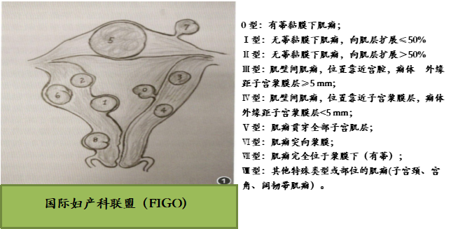 为了更进一步了解子宫肌瘤,国际妇产学会(FIGO)将子宫肌瘤分为9类,分别为0型:有蒂黏膜下肌瘤;Ⅰ型:无蒂黏膜下肌瘤,向肌层扩展≤50%;Ⅱ型:无蒂黏膜下肌瘤,向肌层扩展>50%;Ⅲ型:肌壁间肌瘤,位置靠近宫腔,瘤体外缘距子宫浆膜层≥5 mm;Ⅳ型:肌壁间肌瘤,位置靠近子宫浆膜层,瘤体外缘距子宫浆膜层<5 mm;Ⅴ型:肌瘤贯穿全部子宫肌层;Ⅵ型:肌瘤突向浆膜;Ⅶ型:肌瘤完全位于浆膜下(有蒂);Ⅷ型:其他特殊类型或部位的肌瘤(子宫颈、宫角、阔韧带肌瘤)(见下图)。