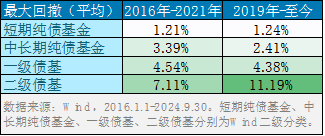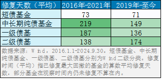 2016年以来债券市场整体经历了两轮调整,我们分别统计了短债基金、中长期纯债基金、一级债基、二级债基的最大回撤及最大回撤修复天数,统计如下: