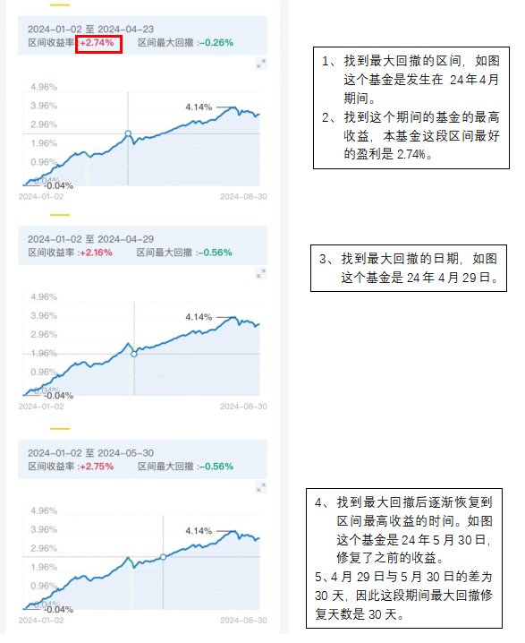 1. 同类基金、相同时间内,基金的最大回撤修复时间越短,一般说明基金历史上的“收复失地”的能力越强。