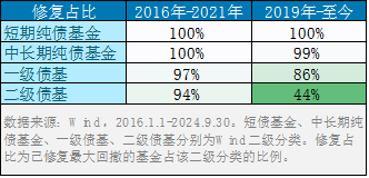 比如在2016至2021年这段时间看,有部分一级债基、二级债基因为持仓债券发生了信用风险,出现较大回撤,这小部分债基仍未修复最大回撤,因此未达100%;2019年至今目前大部分二级债基及相当部分一级债基受到权益市场影响,仍未修复2019年以来的回撤。