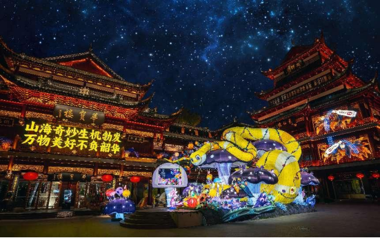 2025豫园灯会带领观众们开启一场奇幻又欢乐的旅程。今年,“山海奇豫记·丛林篇”从宏大叙事视角转入平凡的世界,阐释如同灯火中每一粒微光的每一位平凡人的故事,以“万物美好,众生奇妙”为主题,围绕《山海经》展现丛林包罗万象,生机勃发的神奇景象。世间芸芸众生,每个人都有自己存在的价值与意义,每一盏灯,每一个装置,都是对弱小生命体的致敬和赞美,最终汇聚成“和谐共处、美美与共”的一场“山海奇豫”。豫园灯会使用“山海奇豫记”这个主题已经三年了,从山经、海经到丛林篇,对中国传统文化进行了创新诠释。