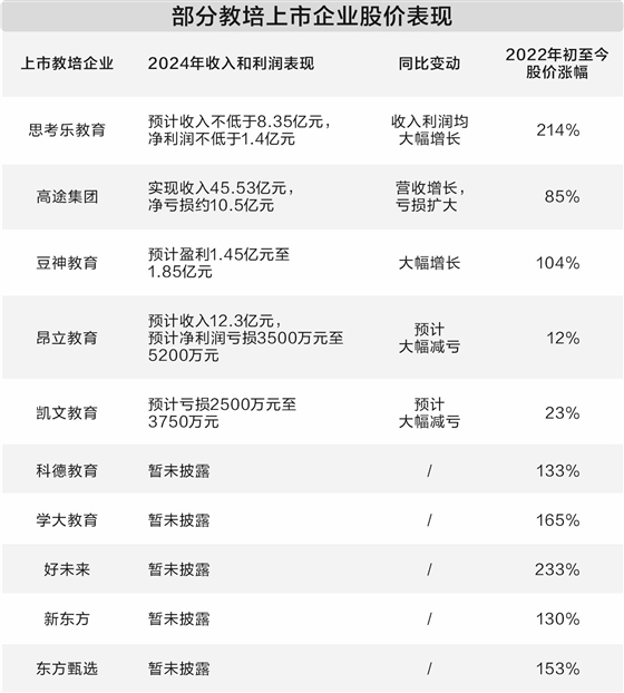 业绩回暖、股价企稳,是近两年教培上市企业发展的主基调。目前,包括思考乐教育、学大教育、豆神教育在内的多家教培企业股价、市值,均已超过“双减”前。