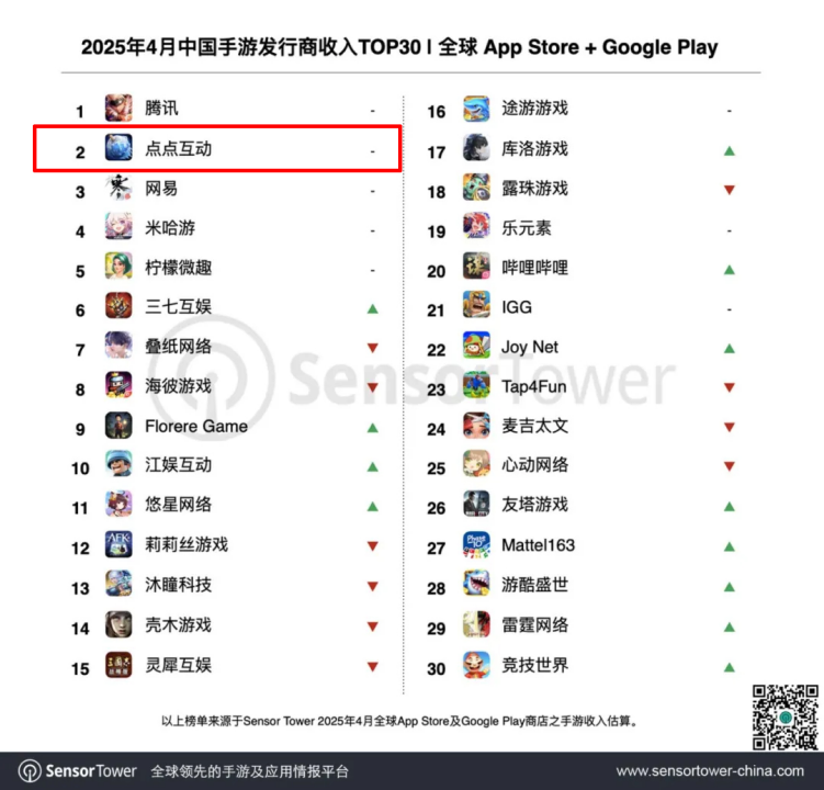 5月7日,Sensor Tower发布《2025年4月中国手游发行商全球收入排行榜 TOP30》榜单。得益于多款策略手游的突破性增长,世纪华通旗下点点互动蝉联中国手游发行商收入榜亚军。这一表现与世纪华通2024年年报及2025年一季度报的业绩大涨形成共振,也再次体现出点点互动作为增长极的硬实力。