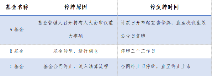 实践中,基金停牌的最常见原因是当基金的场内交易价格出现较大幅度的溢价,明显偏离基金净值时,为了防止投资者盲目跟风买入,遭受较大损失,基金管理人可能会向交易所申请基金停牌,向市场警示风险。这类情况的停牌时间通常较短,一般为一个小时到一天不等,具体以公告为准。