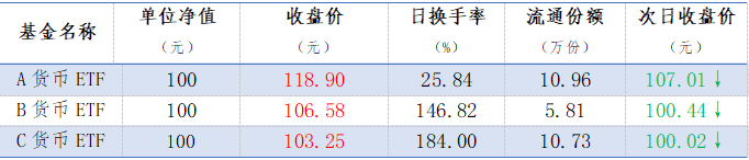 开头提到的几只货币ETF就是这种情形。从下表可以看出,2月11日三只货币ETF的收盘价相对单位净值产生了大幅溢价。分析原因,这些基金场内流通份额较少、流动性不佳,如遇盲目跟风炒作,较小的资金量就能推动交易价格大幅上涨,而后期资金一旦撤离,价格就会很快回落(2月12日的收盘价大幅回落)。为及时提示风险、避免投资者遭受损失,交易所发出了停牌公告。