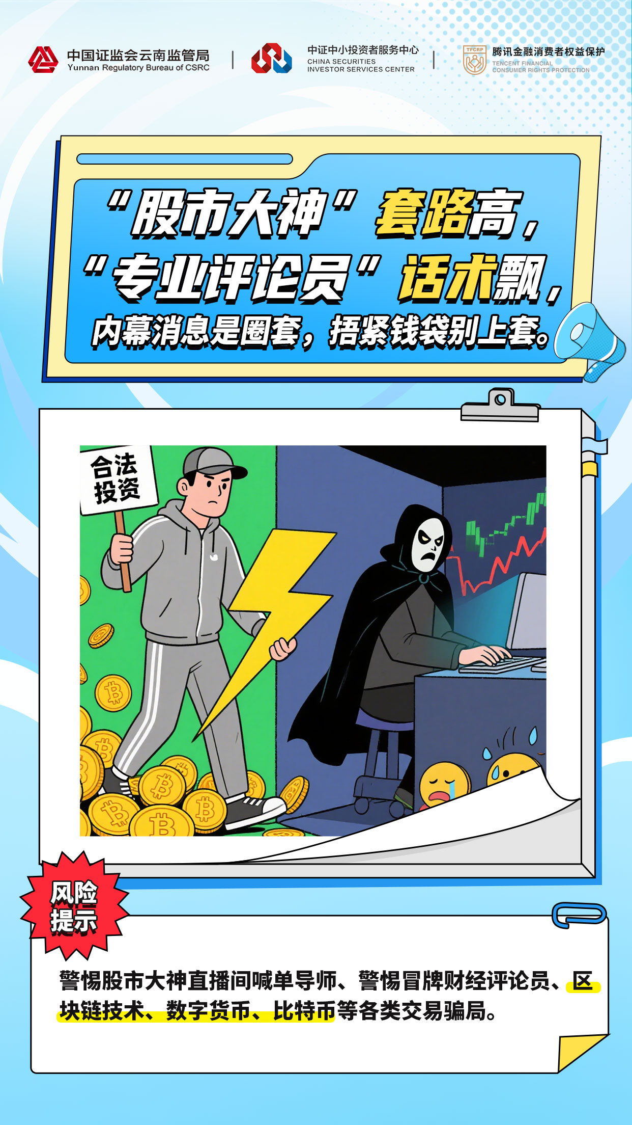 今天,云南片区提醒您:“股市大神”套路高,“专业评论员”话术飘,内幕消息是圈套,捂紧钱袋别上套。