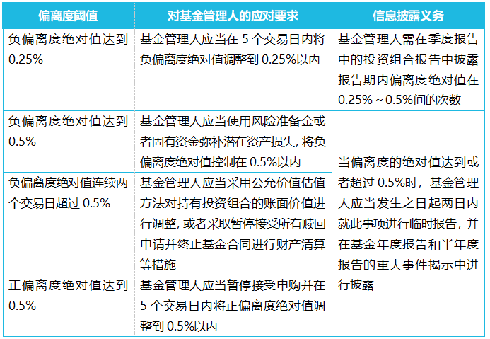 为避免账面价值与实际价格的差异过大,根据《货币市场基金监督管理办法》,货币基金需每个估值日计算偏离度,若偏离度绝对值超过某一水平,基金管理人应采取对应的措施来应对并履行信息披露义务,具体可以查阅下面的表格。