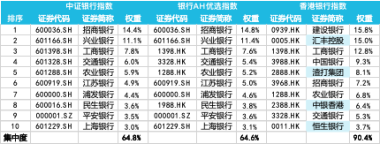 另外,从上面的表格我们可以看出,香港银行指数的前十大成份股集中度最高,为90.4%,而中证银行指数和银行AH优选指数的集中度都在65%左右。