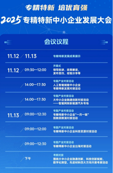 2025年专精特新中小企业发展大会以“专精特新 培优育强”为主题,将于11月11日至13日在重庆市举办。大会将举办1场开幕式、1场发展成果展示、5场专题产业对接活动,以及4场特色产业考察活动。