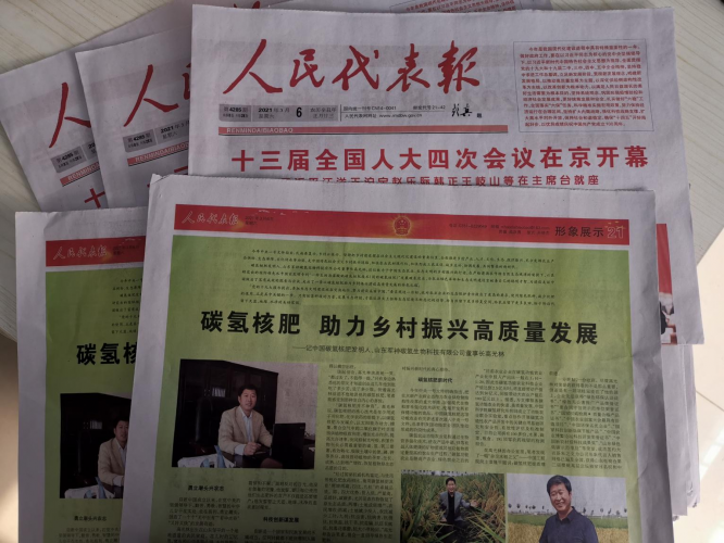 3月6日,人民代表报两会特刊以“碳氢核肥-助力乡村振兴高质量发展”为主题整篇内容报道了中国碳氢合肥发明人、山东军神碳氢生物科技有限公司董事长高光林的先进事迹,人民交通网、凤凰网、网易、CCTV中视文化网、农业发展网、现代农业经济网、中国财经日报、菏泽日报等多家媒体对此报道。