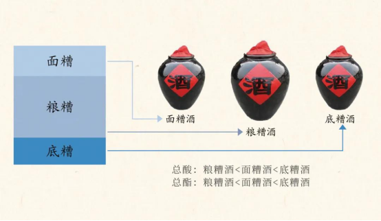 上层的面糟酒乙酸乙酯含量高,偏清雅,作为调味酒使用;处于中间层的粮糟酒粮香舒适,口感协调,突出粮香的同时,具备传统特香基酒风味,因此作为特香型基础酒使用;而底糟酒窖香浓郁,风味醇厚,则作为调味酒使用。