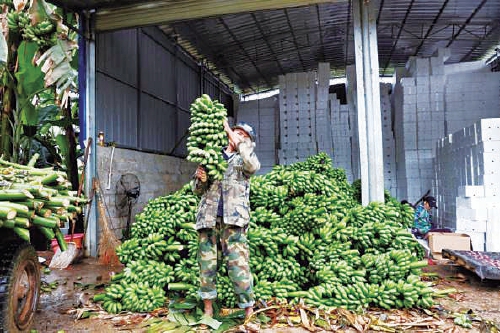 小米蕉“火”了后,不少村民都过上了早上砍蕉白天打包的“双工种”生活。 安舜 摄