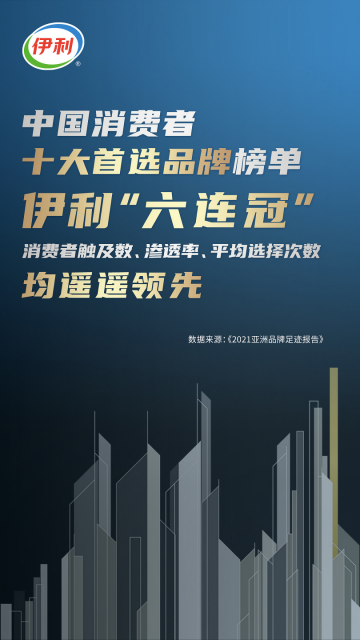 6月16日,凯度消费者指数发布了《2021亚洲品牌足迹报告》,伊利凭借92.2%的品牌渗透率、近13亿的消费者触及数,连续6年成为消费者选择最多的品牌。在这份揭晓亚洲各地区消费者选择最多、最经常购买品牌的报告上,伊利各项指标在中国消费者十大首选品牌榜单上遥遥领先,持续领跑中国快消品市场。