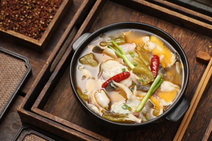 不过,一锅满足味蕾的酸菜鱼汤,仅有酸味优越是远远不够的。要再加上的烘焙过的辣椒,油腺饱满的花椒,辣味和椒麻味在嘴里冲撞,酸、麻、辣、鲜四味和谐,鱼生有它,吃饭更香。