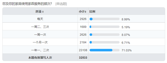 参与调查问卷的人群主要年龄分布在20-50岁,地域分布较均匀。调查数据显示,家庭使用家政服务的频次为一年2-3次的用户数占比达到71.03%,仅有8.99%的家庭每日都使用家政服务,从中可以看出,该行业存在着很大的发展空间。