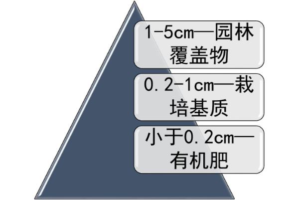 园林废弃物三级利用机械化技术模式是根据木质残枝的生物学特性,选用高效的粉碎机将残枝破碎,并把破碎后的残枝分选为1-5cm、0.2-1cm、小于0.2cm这3个等级,分别用于有机覆盖物加工、栽培基质加工和有机肥加工,从而真正意义上实现了园林废弃物的全量化利用。