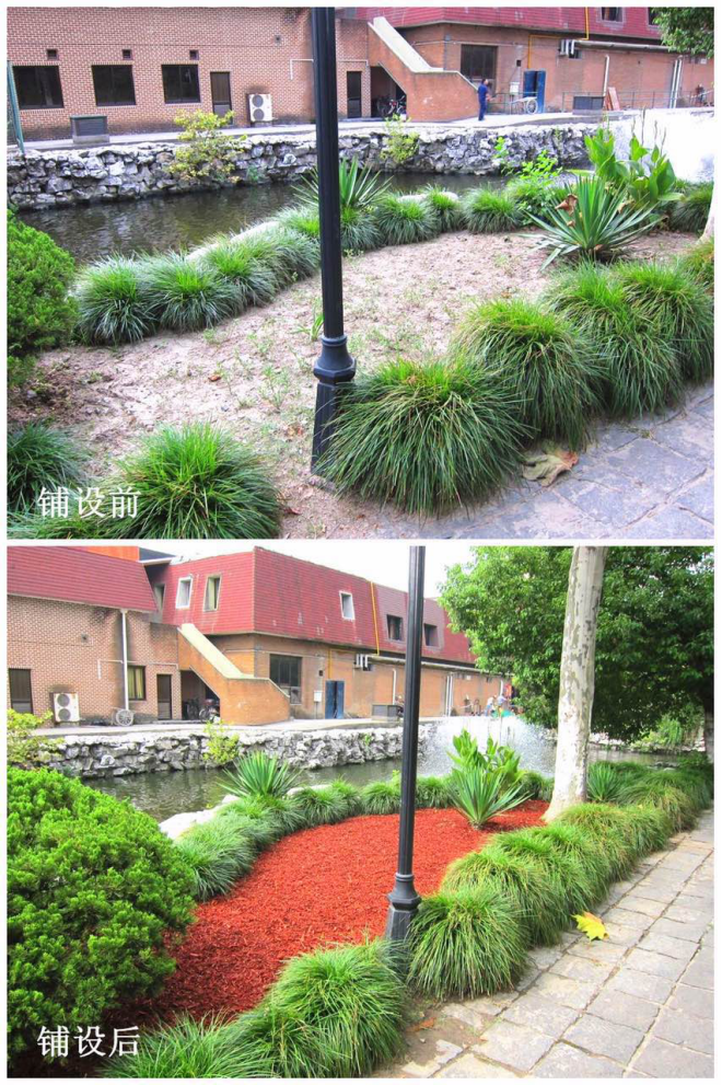 同时,土壤表层的覆盖,可以减少土壤水分蒸发,在降雨后还能吸附雨水,增加土壤持水力,从而起到保持土壤水分的作用。若将有机覆盖物铺设在城市道路景观树木根部,不仅美化了道路环境,还可显著减少树木的浇水次数。同时,有机覆盖物还可防止暴雨或浇水对植物根系的冲刷,起到一个明显的缓冲作用,可有效防止土壤侵蚀和水土流失。
