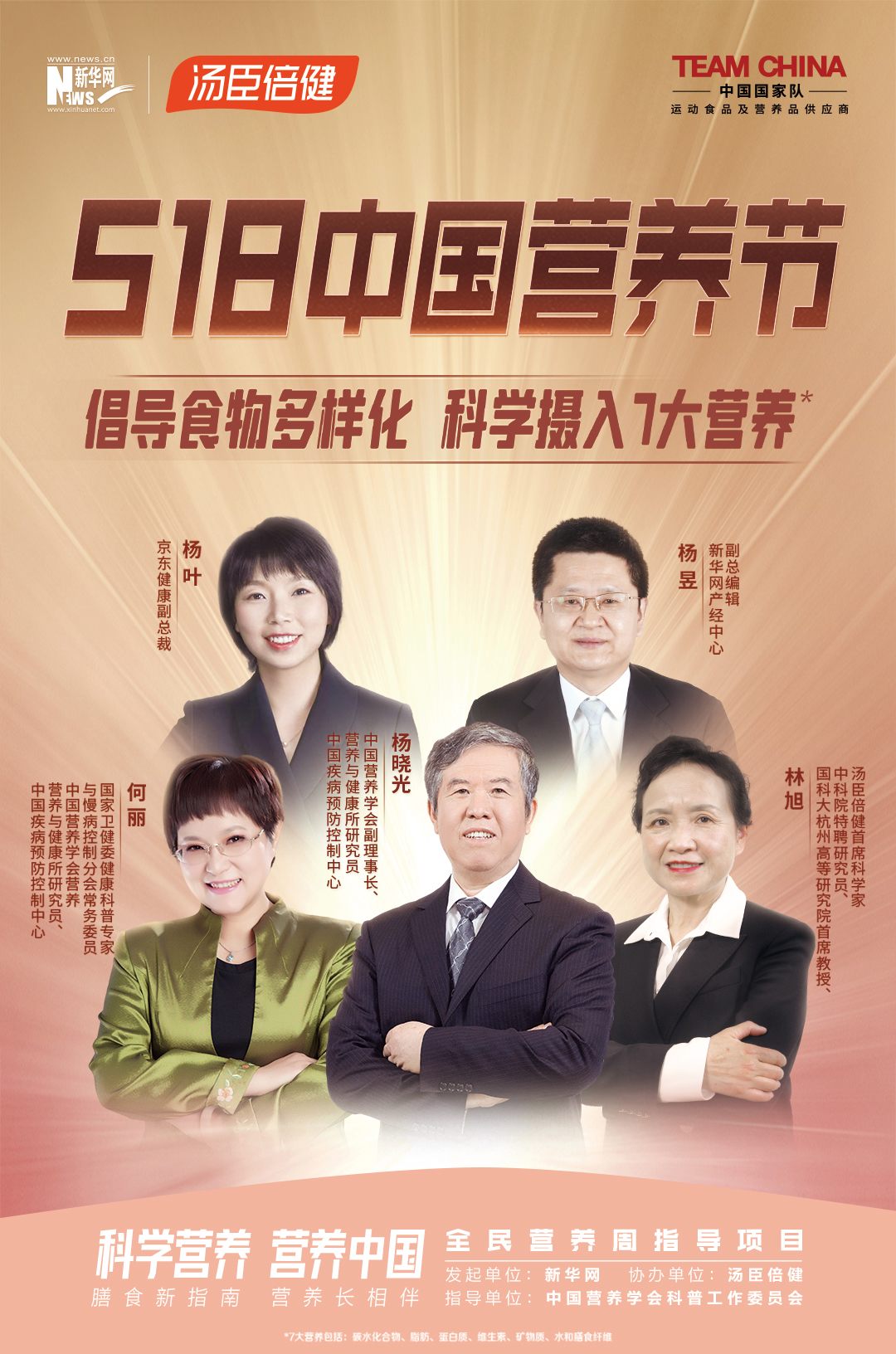 5月18日,由新华网主办、汤臣倍健协办、中国营养学会科普工作委员会专业指导的“518中国营养节”正式启动。首届“518中国营养节”响应《“健康中国2030”规划纲要》号召,以“科学营养,营养中国”为主题,提出“倡导食物多样化,科学摄入7大营养”的科学营养观,帮助国民树立健康意识,改善健康水平,提升生命质量。