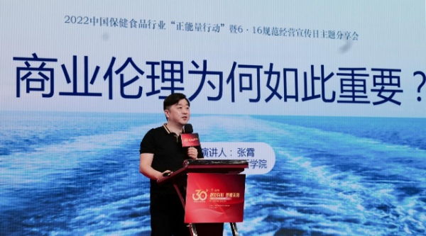 6月16日,“规范有形 梦想无限”2022中国保健食品行业“正能量行动”暨6·16规范经营宣传日直播分享会通过线上方式举办。会上,中国人民大学哲学院副院长张霄作了题目为《为什么商业伦理如此重要?》的主题演讲,他表示,保健食品行业要抓住机遇、谋求更大的发展,必须提升行业的商业伦理。