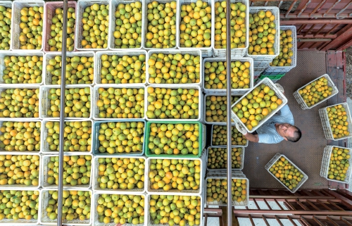 7月6日,湖北省宜昌市秭归县泄滩乡陈家湾村村民将收获的夏橙装车。
