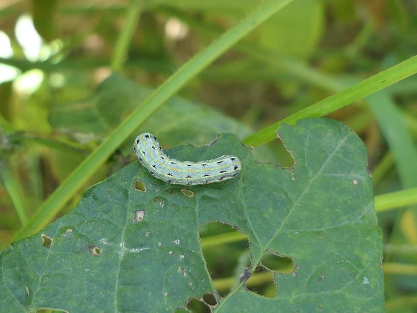 张智博士接着说:“这几头肉虫子分属于不同的种类,都是吃十字花科蔬菜的高手。您瞧,这个气门后上方有一个明显白斑的是甜菜夜蛾。它们以幼虫造成为害,体色变化多,一般是绿色或暗绿色,白斑是它们独特的特征。”