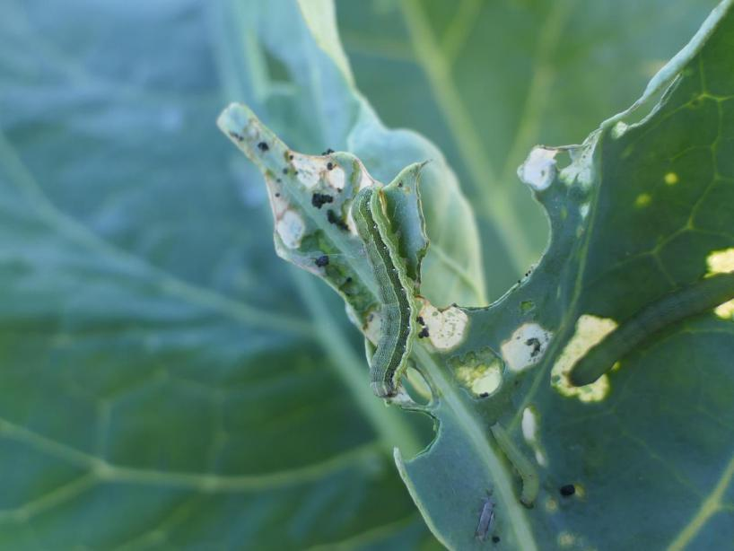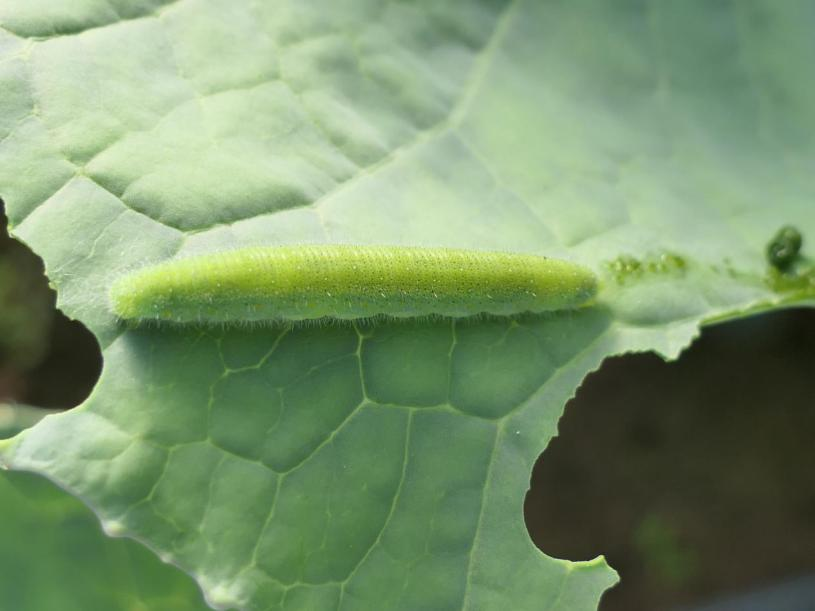 能吃菜叶的还有两种绿色虫子,分别是菜青虫和小菜蛾。菜青虫比较懒,碰一下基本不会理你,会一直待在那里把叶子吃出洞洞或缺刻。它的妈妈是菜粉蝶,幼虫圆筒形,中段较肥大,身体上长满了细小的黑色毛瘤。小菜蛾就不同了,它的幼虫一碰就倒退着跑。小菜蛾两头尖,身体纺锤形,明显呈一节一节的,生性活泼,被扰动后激烈扭动并后退。它的小幼虫仅吃叶肉,形成天窗斑;3~4龄幼虫可将菜叶吃成孔洞,严重时全叶被吃成网状。造成类似为害状的,还有斜纹夜蛾幼虫。斜纹夜蛾幼虫最明显的特征就是各节背上有1对近似三角形的半月形黑斑。这家伙后期还可钻入叶球内为害,把内部吃空,并排泄粪便,造成污染。
