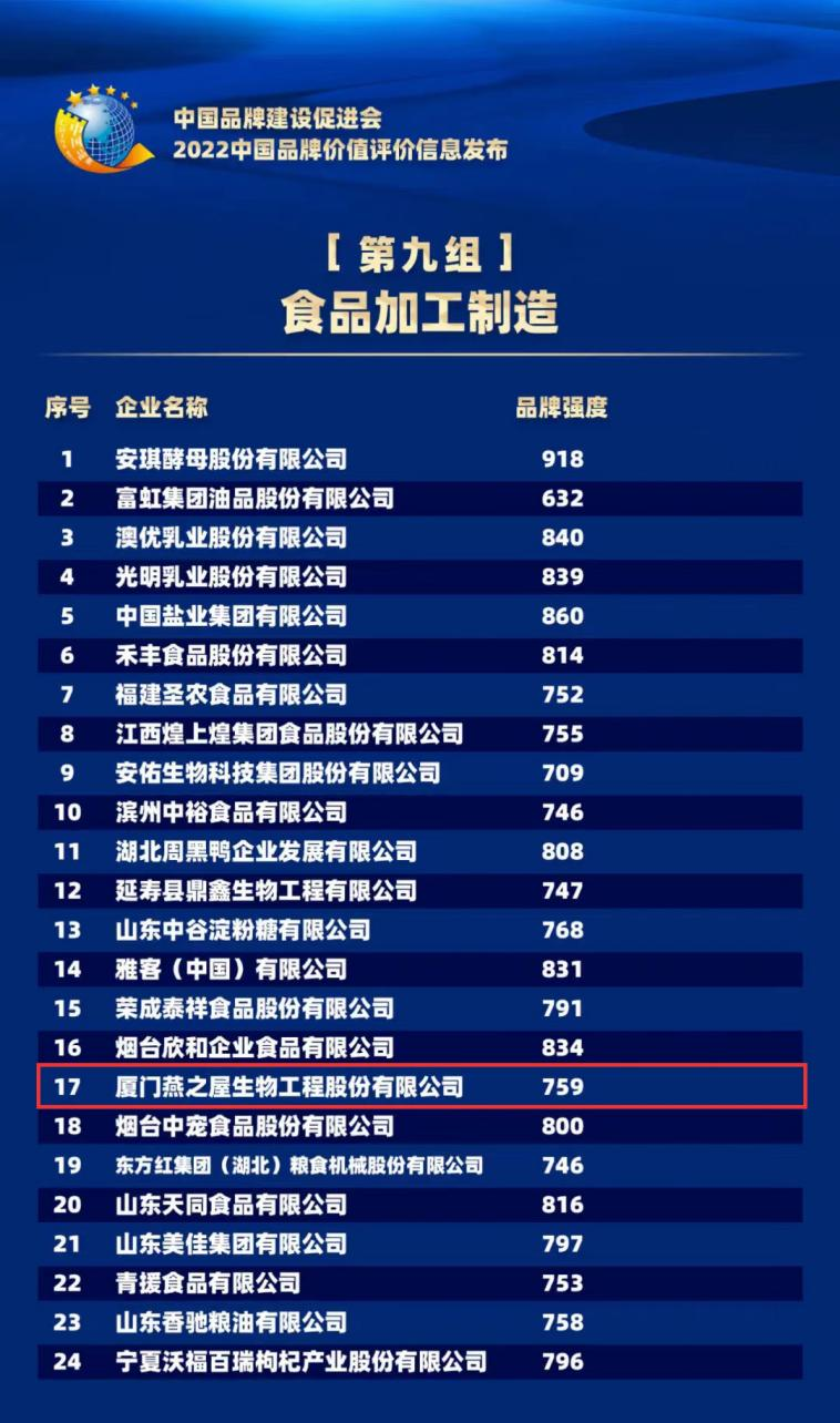 图:燕之屋作为唯一燕企入选2022中国品牌价值评价信息发布榜