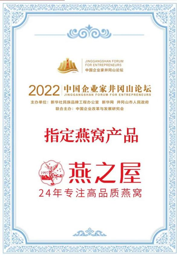 图:燕之屋荣膺2022中国企业家井冈山论坛指定燕窝产品