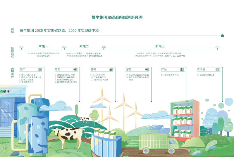 在“双碳”成为国家战略后,蒙牛积极响应国家号召,与波士顿咨询公司携手制定了明确的“双碳”战略目标,即到2030年实现碳达峰、2050年实现碳中和,并提出了优于全行业的碳排放总量、强度的控制目标,将通过6大环节15项举措,积极稳妥推进碳中和。