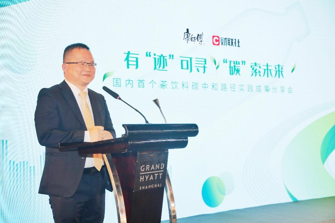 中国企业联合会雇主工作部副主任、前联合国全球契约组织中国网络执行秘书长韩斌赞赏康师傅首个茶饮料碳中和路径实践成果,同时分享了企业碳中和路径图。