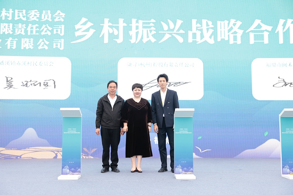 下午是重要签约环节。赤溪村书记吴贻国与谦寻控股副总裁杨兰、福鼎市闽禾农业有限公司总经理刘新杰签订“乡村振兴战略合作”协议。福鼎市副市长郑兴邦授予谦寻旗下直播间“福鼎市乡村振兴白茶推广合作单位”荣誉。