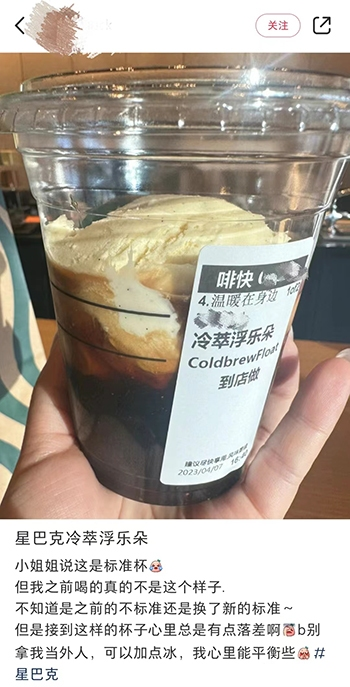 据悉,星巴克中国地区门店饮品通常分为中杯(Tall 355ml)、大杯(Grande 473ml)、超大杯(Venti 592ml)三个杯型可供选择,而以麦芽雪冷萃为代表的冰激淋系列多款产品,虽将容量缩减至325ml,却并未针对这一规格单独开模制作一套适配杯型,依旧使用中杯进行出品,从而导致消费者拿到饮料后会产生不满杯的感官体验。