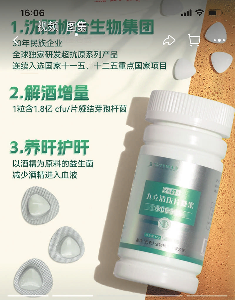 然而,在网购平台上,原为固体食品的压片糖果却宣称有各种神奇的功效。5月11日,记者打开一个购物平台APP,以关键词“压片糖果”搜索,跳出了各种名称的压片糖果产品。记者在SAGXH食品旗舰店看到,该店销售一款名为“九立清压片糖果”的产品,视频广告称“吃上二粒酒场不惧”,图片广告称“酒前服用:增酒量防酒醉;酒后服用:助解酒 止头痛”“酒前两粒来者不拒”“解酒增量养旰护旰”。该产品生产厂家为巨余(长兴)生物技术有限公司,厂址在浙江省湖州市。