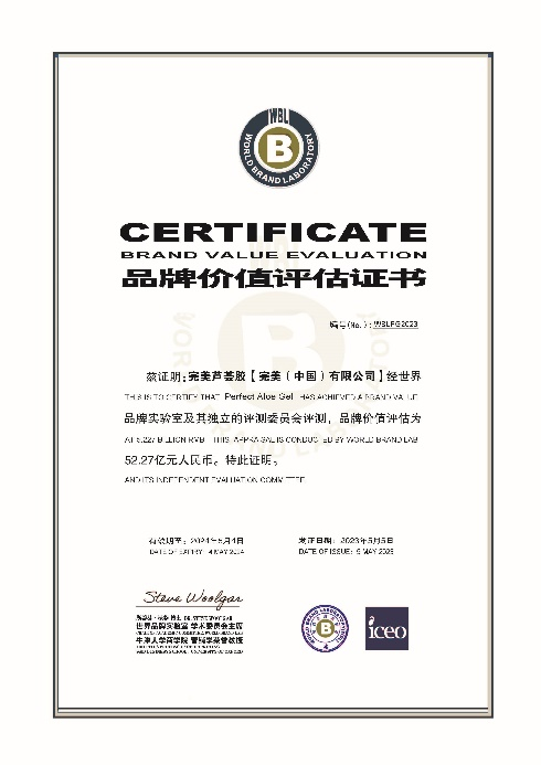 2023年5月,在“共担时代责任 共创美好生活”——健康品牌建设与健康产业高质量发展论坛上,完美公司发布了完美芦荟胶的品牌价值。经品牌评估顾问机构世界品牌实验室及其独立的评测委员会评测认证,完美芦荟胶2022年度品牌价值为52.27亿元人民币。作为完美公司的拳头产品,完美芦荟胶深受消费者的认可和喜爱,在消费层面具有极强品牌美誉度和认知度。据不完全统计,近30年来,通过完美公司官方授权渠道销售的完美芦荟胶累计已经超过了5亿支。