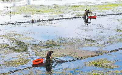 江苏省盱眙县小龙虾养殖面积达百万亩,形成了苗种繁育、成虾养殖、龙虾加工、成品销售、特色餐饮等为一体的小龙虾产业链。图为虾农在盱眙县穆店镇维桥村捕捞小龙虾。