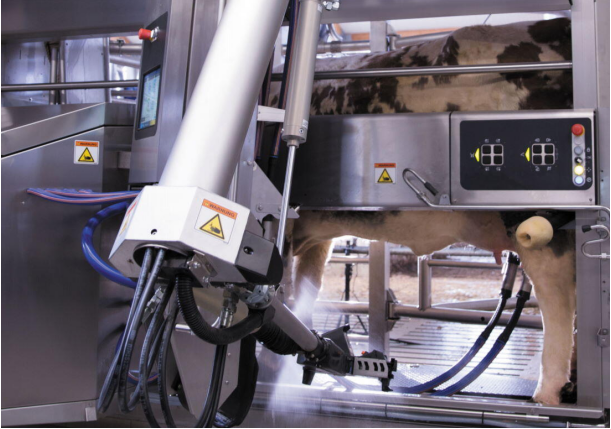 自动挤奶机器人设备能够根据每一头奶牛不同的体况,精准探知乳头位置进行挤奶,自动进行清洗、套杯、脱杯的标准化挤奶流程,实现了无人化、操作的标准化和一致性,奶牛挤奶时的舒适度更好。