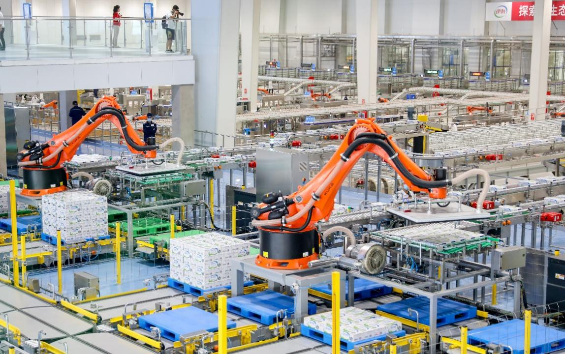 在总投资50亿元的伊利健康谷液态奶全球智造标杆基地,码垛机械手臂灵活旋转、AGV无人驾驶小车智能躲避障碍物流畅穿行,全球一流仓储系统智能管理……目前,该基地日处理原奶可达到6500吨,是全球乳业首家引入全球速度最快、每小时灌装40000包生产线的工厂,每天生产的牛奶可充足保障千万级人口城市的日饮奶需求。还有伊利奶粉全球智造标杆基地,总投资30亿元,年产能6万吨,是目前全球产能领先、技术一流、数智化程度先进的高端婴幼儿配方奶粉生产基地。