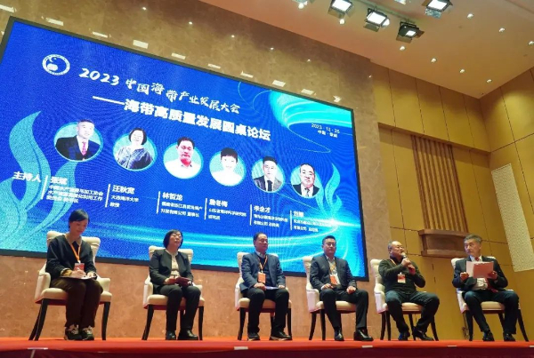 圆桌论坛以推动海带产业高质量发展为主题展开对话。青岛博智汇力生物科技有限公司董事长兼总经理张斌主持该环节,大连海洋大学教授汪秋宽、福建省连江县官坞海产开发有限公司董事长林哲龙、山东省海洋科学研究院研究员、山东省藻类产业技术体系首席岗位专家詹冬梅、荣成市鑫城山海洋昆布科技有限公司总经理刘翚、青岛达康海洋生物科技有限公司总经理李全才分别从科学研究和企业经营的角度分享了在海带育苗、养殖、加工、销售及高值化利用等方面开展的工作,取得的成效和遇到的问题。