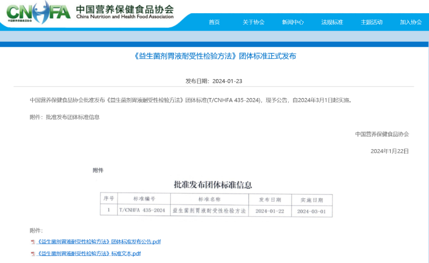 1月22日,中国营养保健食品协会正式发布《益生菌剂胃液耐受性检验方法》团体标准。该标准首次建立了益生菌剂胃液耐受性检验方法标准,为益生菌活菌率检验标准再添新维度,将助力益生菌产品质量提升与行业高质量发展。