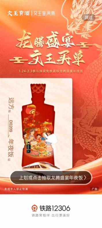 春节期间恰逢铁路运输人流量高峰期,12306作为中国铁路唯一官方互联网售票系统,是覆盖14亿国民出行的超级流量池。文王贡酒率先在春节期间霸屏12306中国铁路app,通过吸睛的活动传播素材和年味满溢的抽奖互动,精准匹配安徽区域春运人群,平台曝光量达581.1万,实现品牌高光亮相和影响力提升的双效目标。