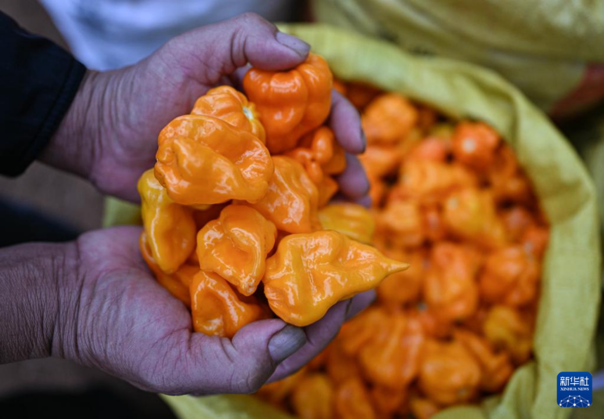 2月26日,海南省海口市龙华区遵谭镇龙合村村民展示采收的黄灯笼辣椒。