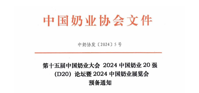 3月6日,中国奶业协会发布通知称,拟于2024年6月18-20日在武汉国际博览中心举办第十五届中国奶业大会 2024中国奶业20强(D20)论坛暨2024中国奶业展览会。