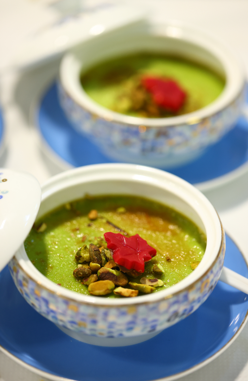 这道甜品采用中式装盘,中西合璧。使用茉莉花茶与牛奶烤制布丁,甜蜜的焦糖和浓郁的开心果融合,特别点缀加拿大枫叶巧克力,消热清暑,口感嫩滑,体现口味层次感。