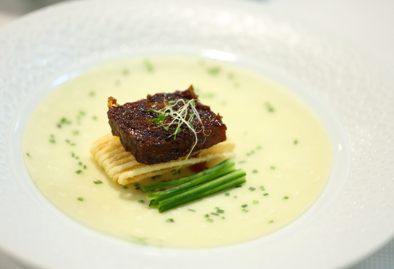 “乳玉云片片,绵绵起酥心。” 这道热菜融入上海红烧烹饪技艺,以饼皮搭配牛肉为基础,陈皮作为夏季健康食材,甜中带微辣,增添香气。配上黄瓜的清脆,馓子的香脆,以现代元素呈现别具一格的美食。