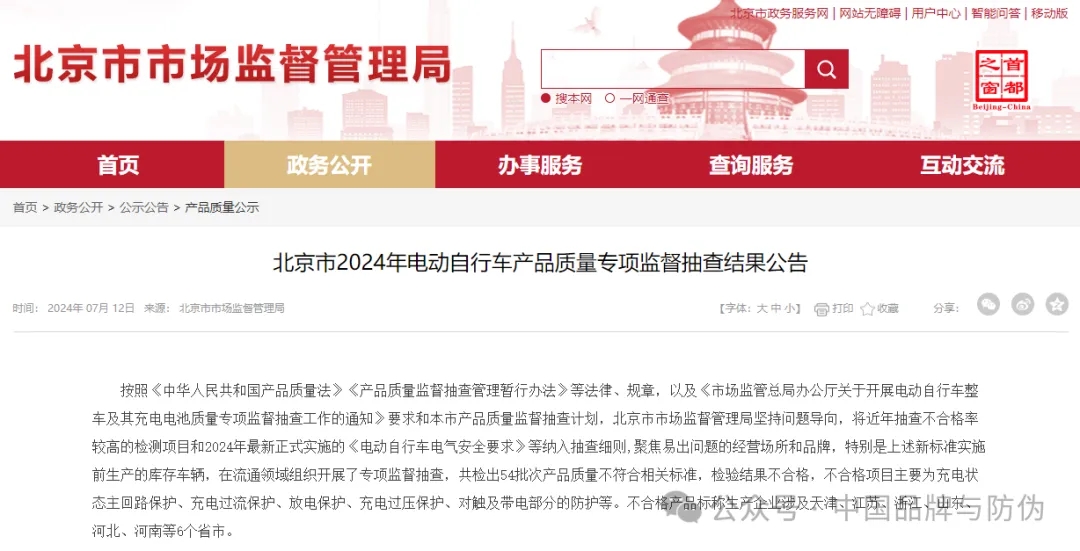 中国品牌与防伪杂志/中国品牌质量网讯 本刊记者从北京市市场监督管理局官方网站获悉,该局于2024年7月12日公告了北京市2024年电动自行车产品质量专项监督抽查结果,此次共检出54批次产品质量不符合相关标准,检验结果不合格,不合格项目主要为充电状态主回路保护、充电过流保护、放电保护、充电过压保护、对触及带电部分的防护等。