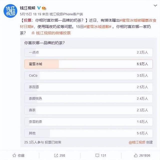 事件曝光后,有媒体在微博发起了“你相对喜欢哪一品牌的奶茶”的投票,在25万的样本调查下,蜜雪冰城战胜了喜茶 、奈雪的茶、一点点等品牌,获得了最多人数的支持。